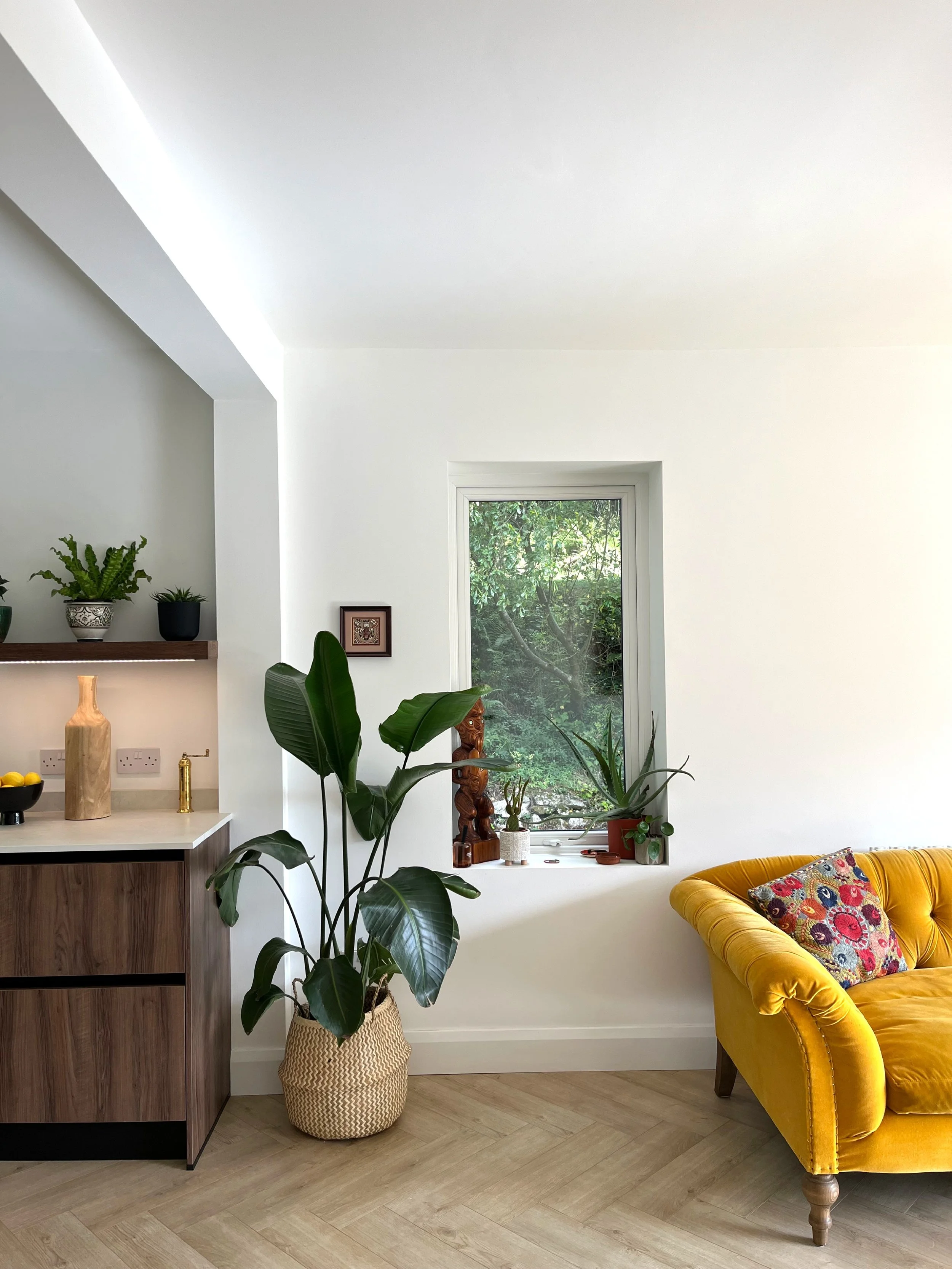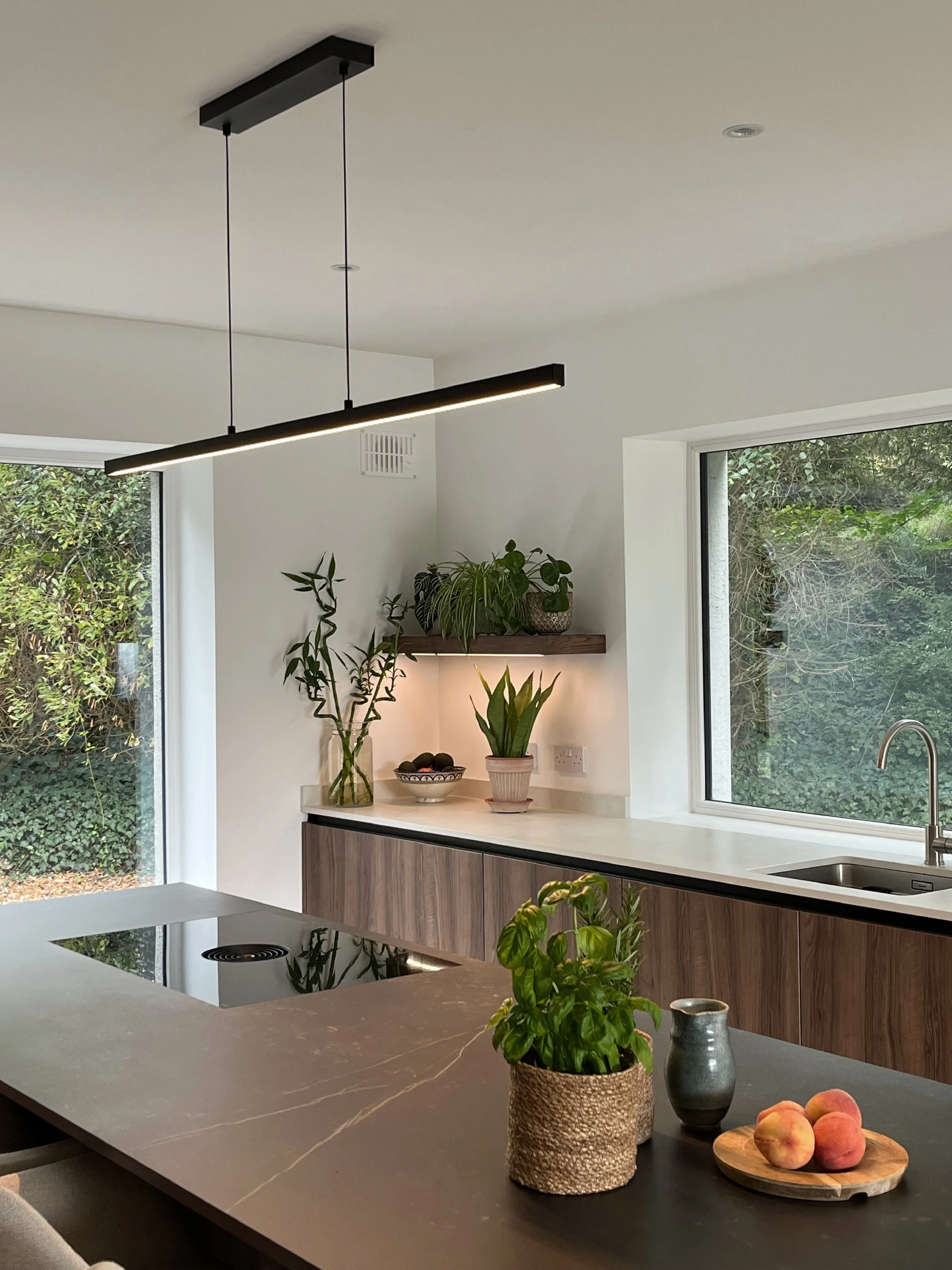 One of our modern German kitchens with our warm oak cabinetry and durable Dekton worktops. Our custom-made pantry with wooden bottle racks provides ample storage for all the dry food. Premium Siemens and BORA appliances.